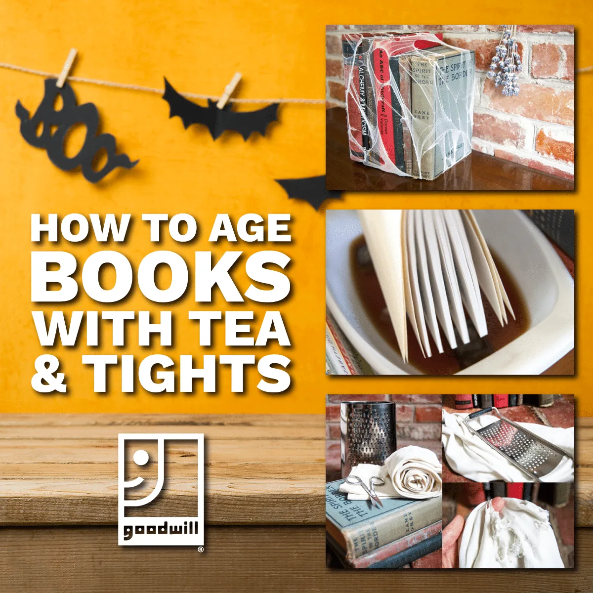Yes, you read that title right! It turns out that it’s really easy to make thrifted tights into spooky spider webs and to tea-stain the pages of a secondhand book — creating the perfect antique appearance. These two projects partnered with our tips for aging the outside of Goodwill books will give your library a complete facelift just in time for Halloween.