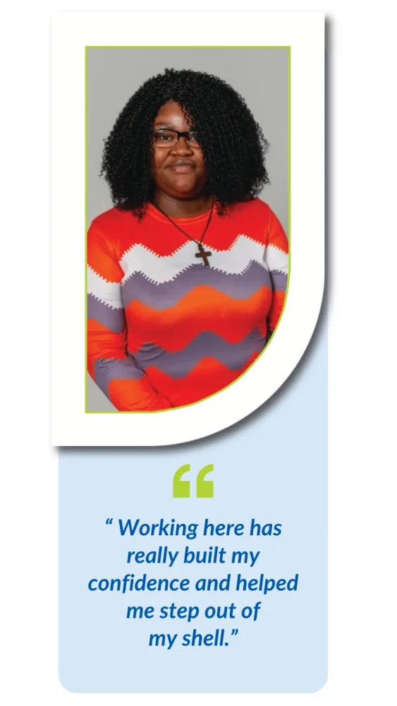 Born in Elloree, Shanell struggled with confidence, and speaking to strangers felt overwhelming. That changed when she joined our AbilityOne Program.